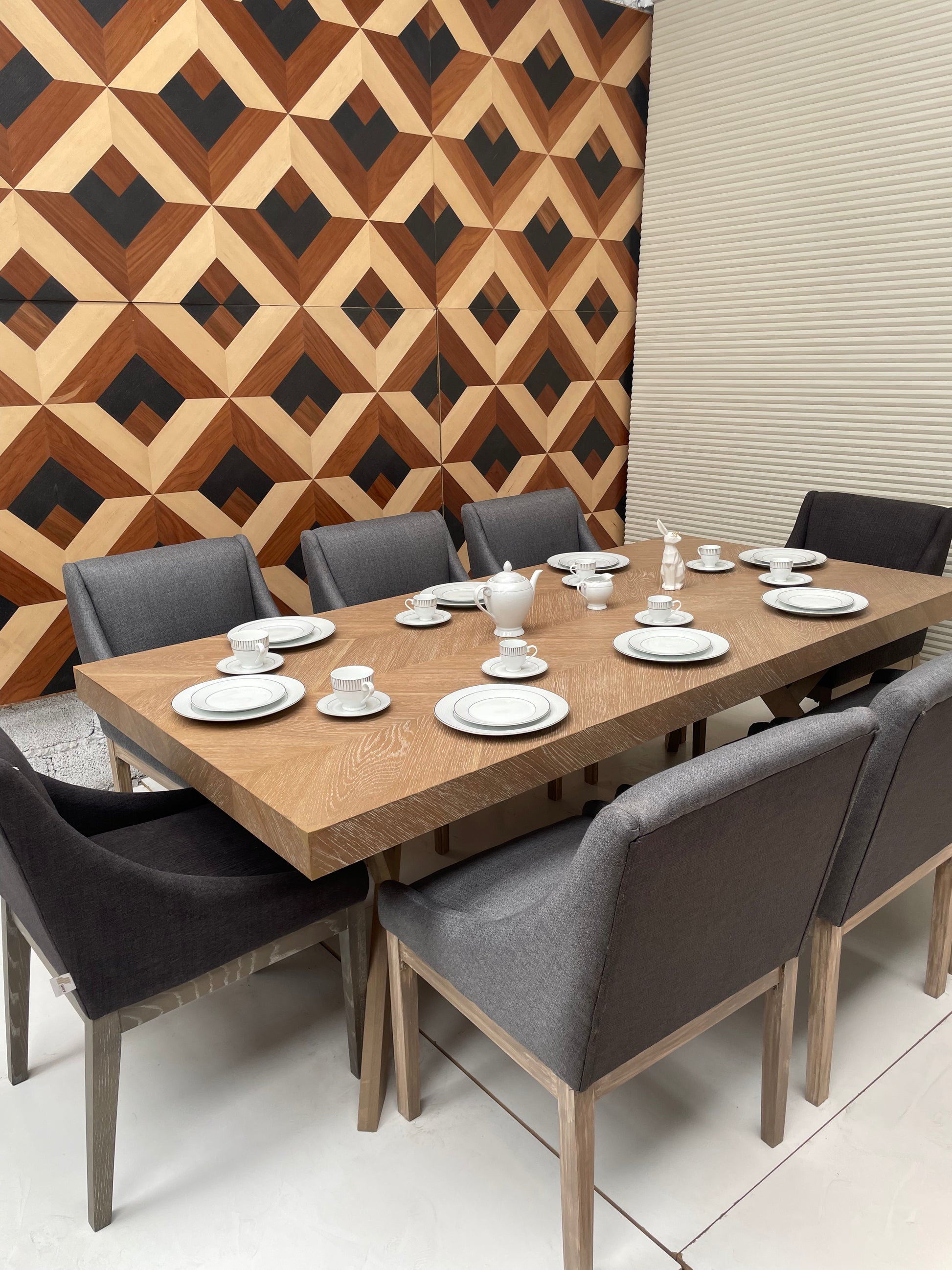 Mesa fabricada en MDF con chapa de encino americano con toque en color gris claro.