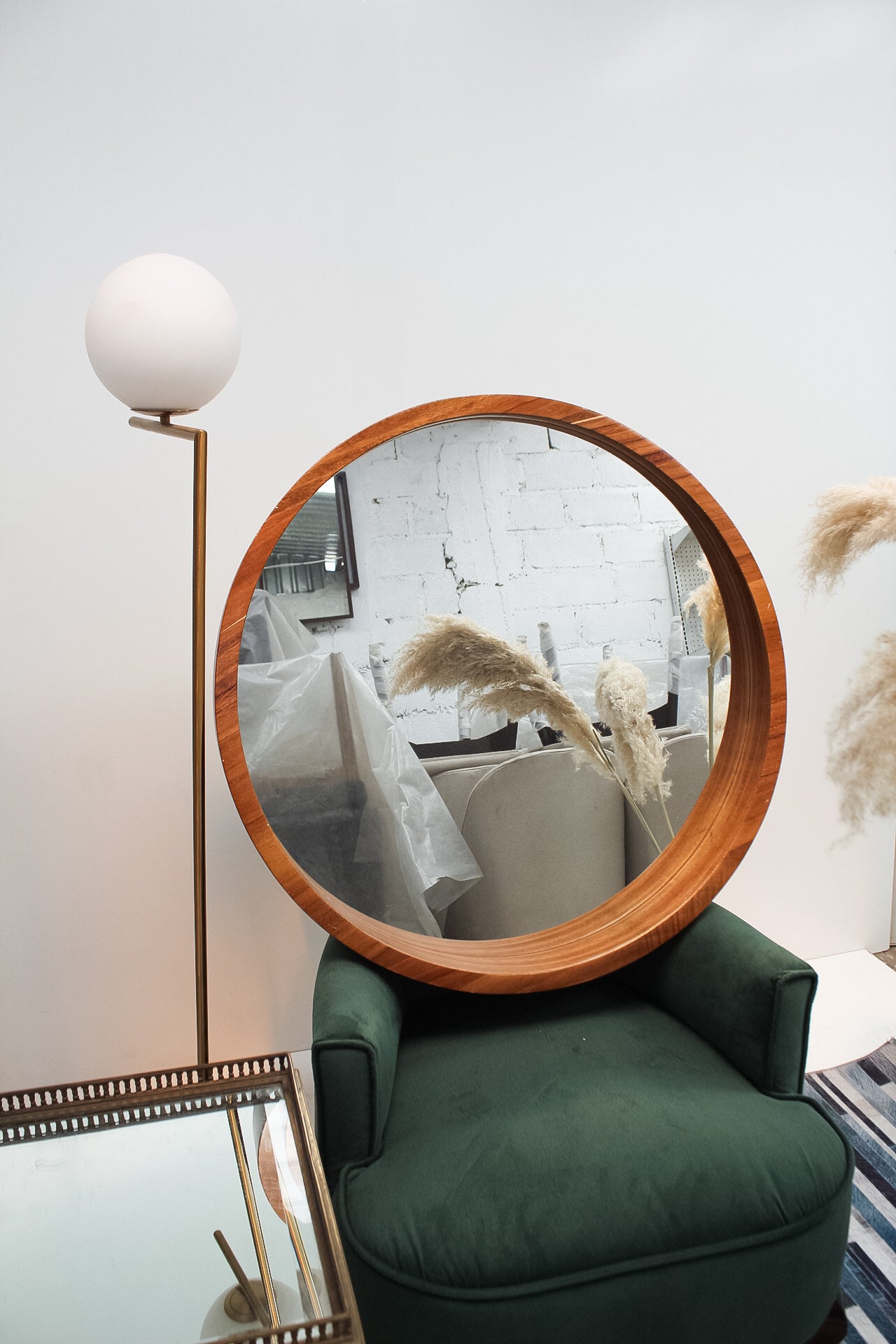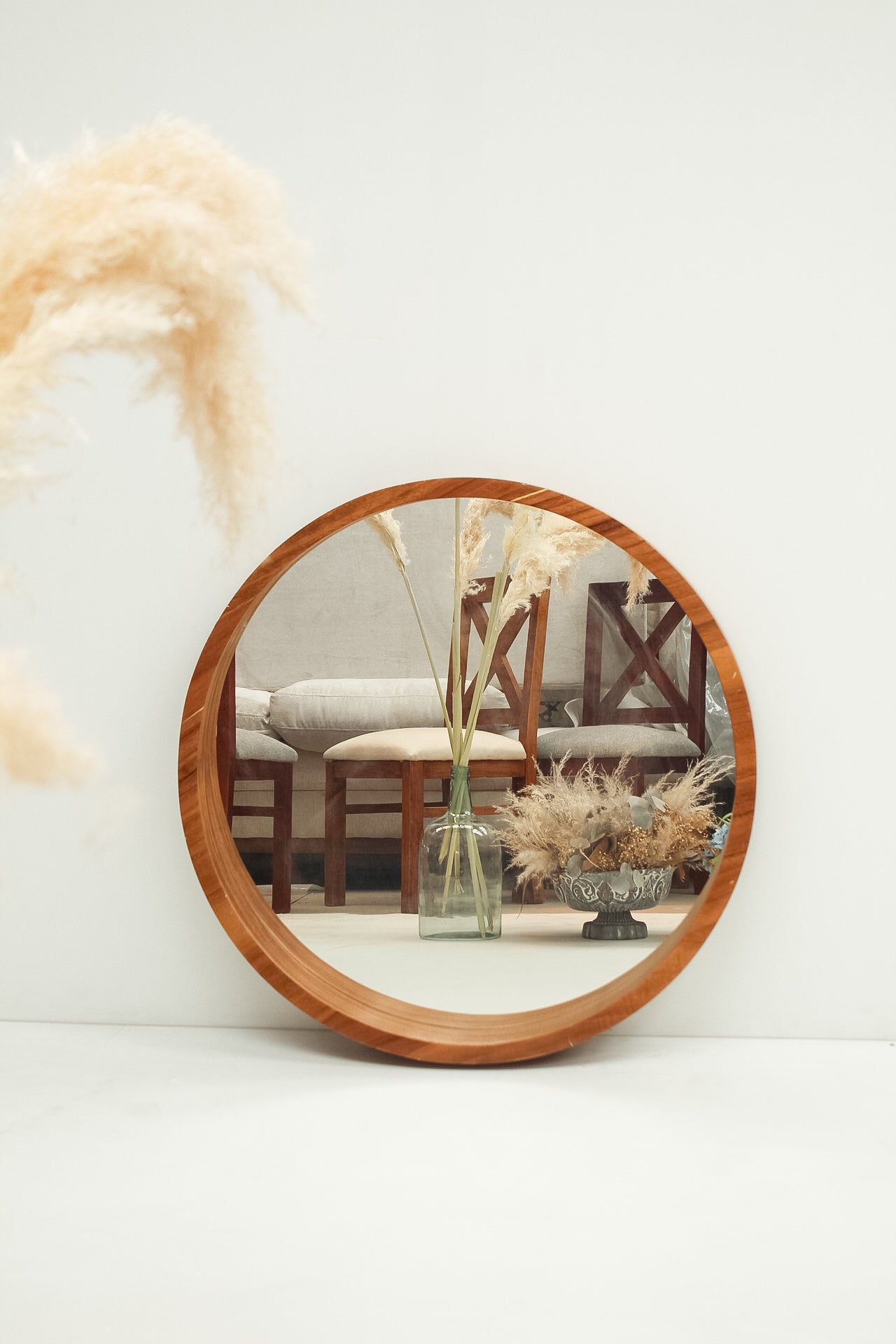 Espejo fabricado en madera de pino con chapa de parota con un diámetro de 80 cm, con un ancho de 5 a 12 cm.