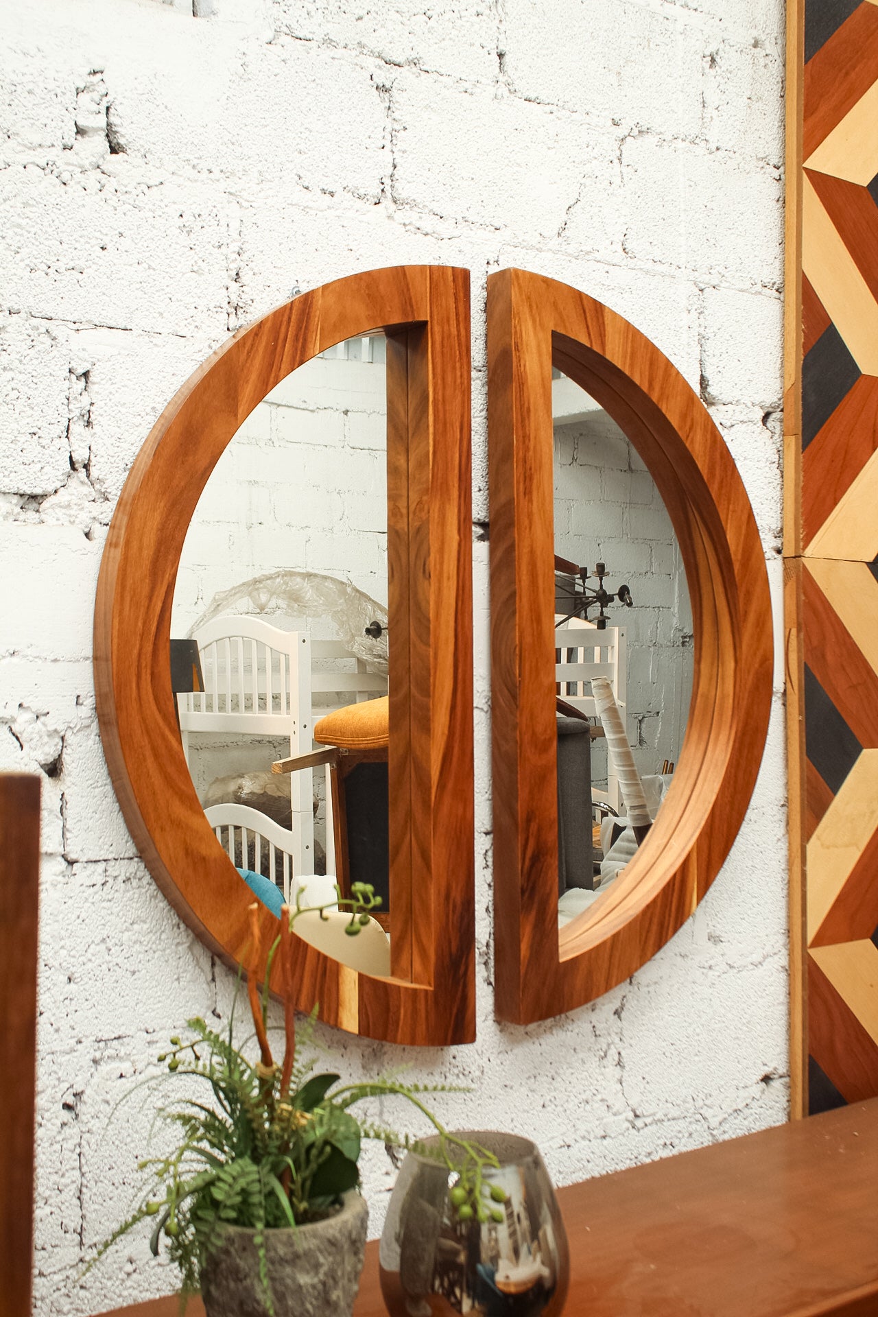 Espejo fabricado en chapa de parota en dos partes con medidas de 80 cm de diámetro y grosor de 10 cm.